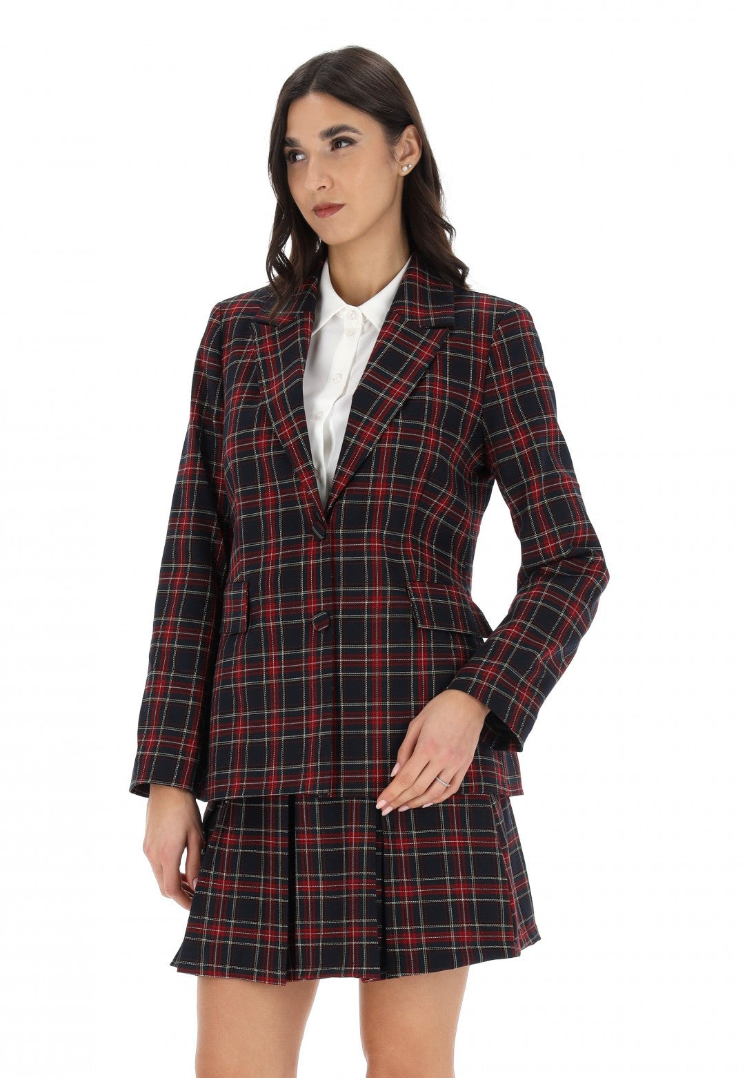 Eleganza e tradizione si incontrano nel blazer Rinascimento in Principe di Galles blu. Ideale con la minigonna plissettata coordinata.