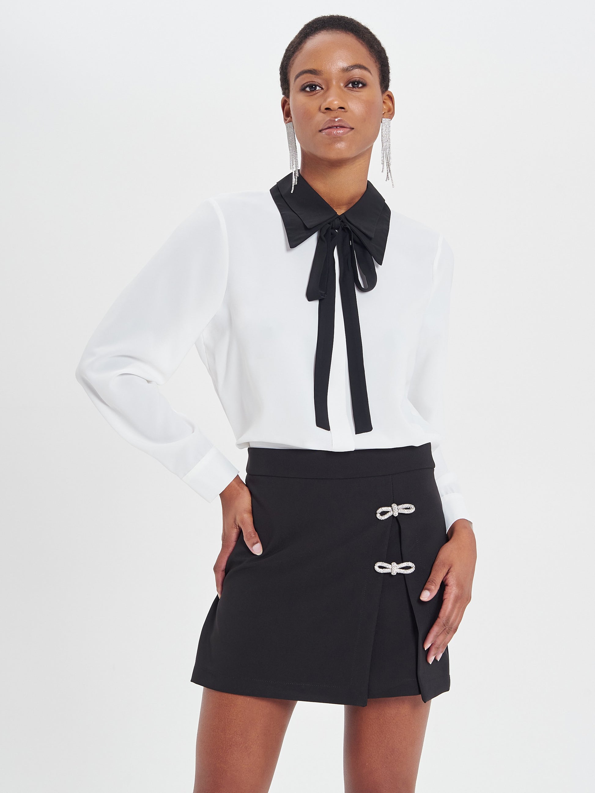 Blusa Rinascimento con collo a contrasto e nastrino al collo. Eleganza personalizzabile e abbinamento perfetto con il pantalone coordinato.