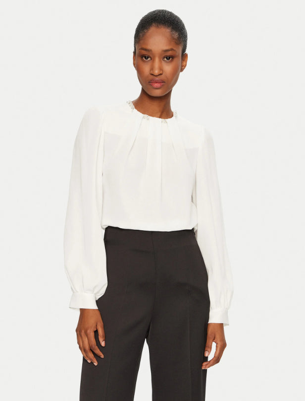 Blusa curvy Rinascimento a maniche lunghe, polsino basso e vestibilità regular. Girocollo impreziosito da perle e Swarovski, perfetta per look eleganti e raffinati. Un capo versatile e di classe per valorizzare la silhouette curvy con stile e comfort.