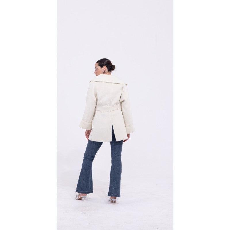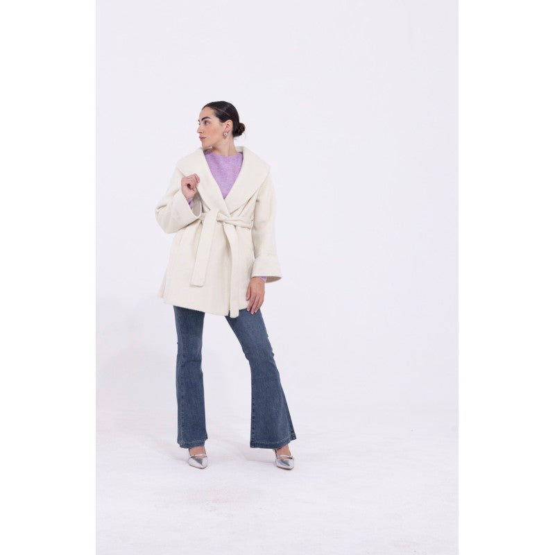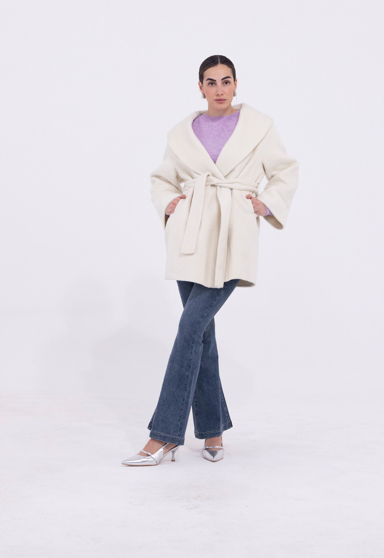 Cappottino donna in misto lana con manica a 3/4, collone sciallato, risvolto ampio alle maniche, spacchetto sul retro e cinturino in vita.