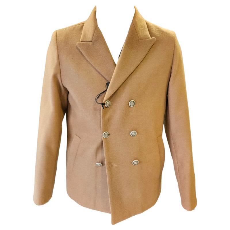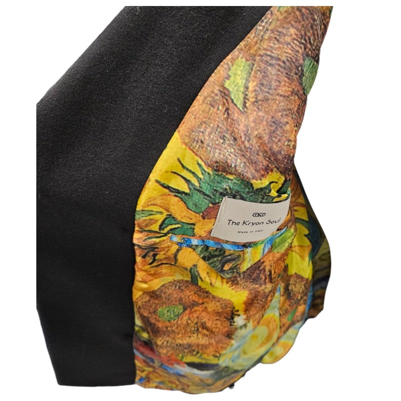 Cappotto corto in panno stretch con chiusura doppiopetto, rever a lancia, bottoni in metallo e fodera ispirata a van Gogh. Vestibilità slim fit, tasche laterali con patta e tasca interna. Disponibile ora nel nostro e-commerce, perfetto per un look elegante e moderno.