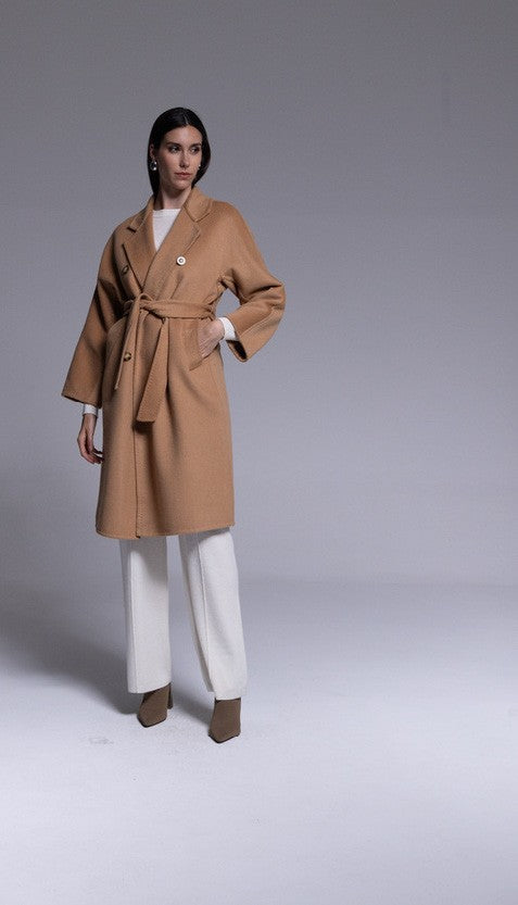 Acquista online il nostro cappotto lungo doppiopetto oversize in lana 100%. Realizzato in morbido panno velour, con dettagli eleganti come bottoni sur-ton e cintura removibile. Scopri comfort e stile per l'inverno!