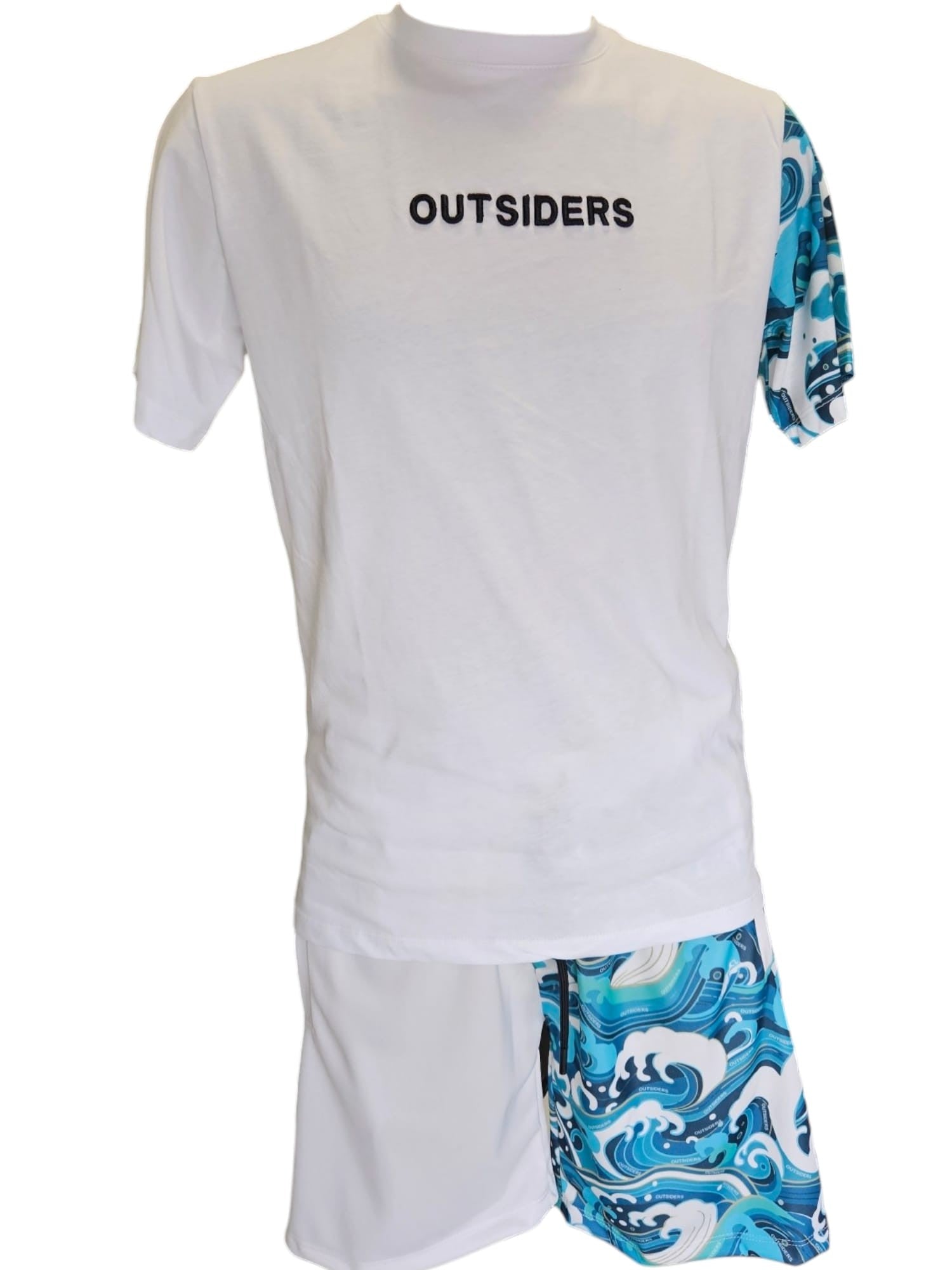 Completo OUTSIDER fantasia mare composto da una maglia mezza manica e da un pantaloncino, entrambi realizzati in cotone per garantire comfort e traspirabilità.