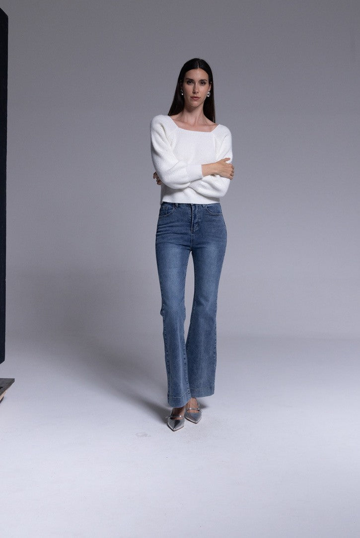 Jeans AN-AIM a zampa con vita alta, lavaggio vintage autentico e tasche posteriori che valorizzano la silhouette. Perfetti per un look retrò ma moderno.