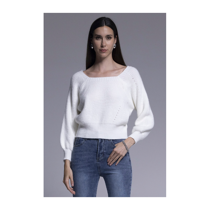 Maglioncino con scollo quadrato, manica raglan 3/4 effetto palloncino. Trama a costa inglese per stile romantico e versatile.