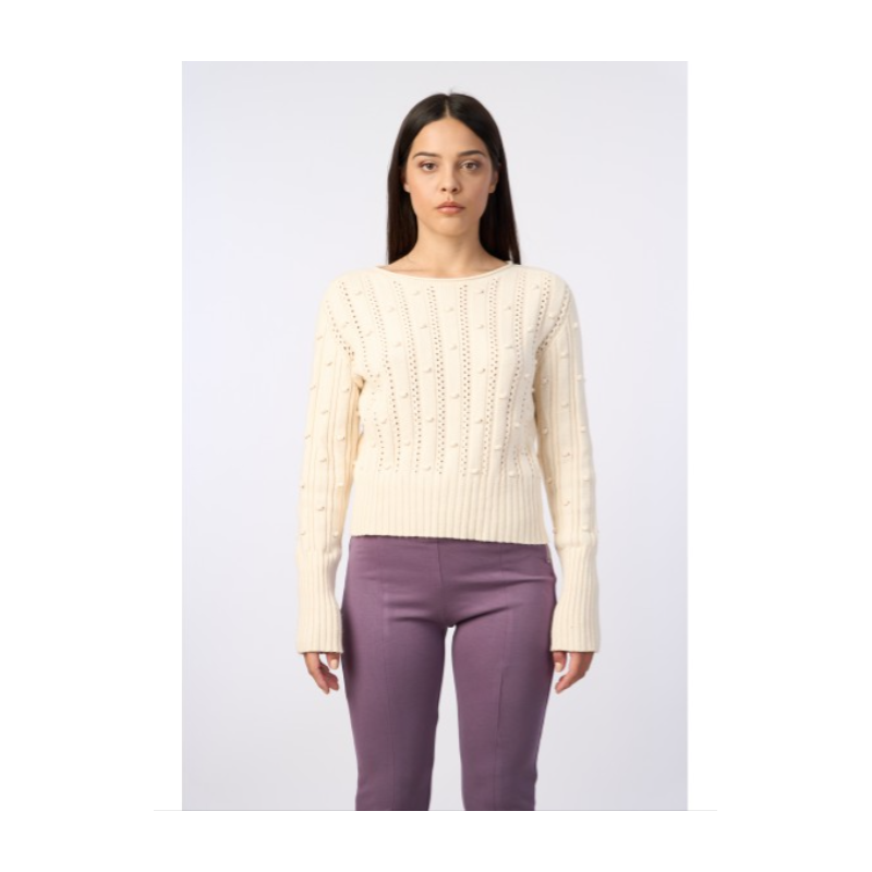 Eleganza e comfort con il maglioncino monocolore a treccia forata: perfetto per look casual o raffinati.