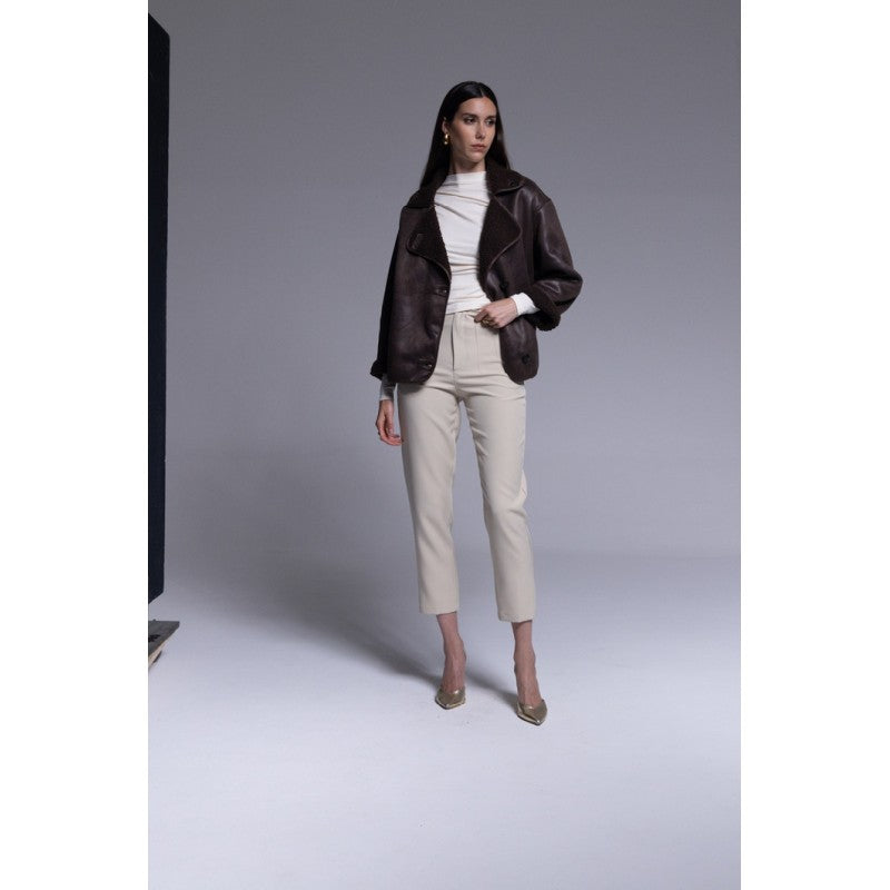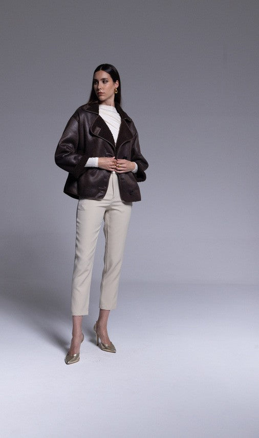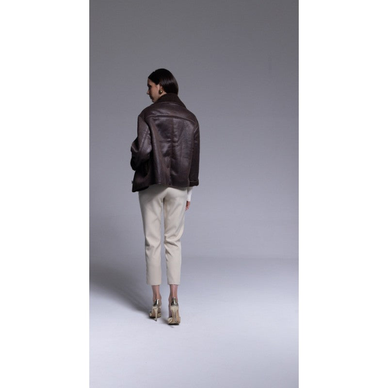 Giubbotto AN-AIM doppiopetto modello montone con pelliccetta interna e colletto elegante. Stile oversize con spalla over e manica corta, perfetto per un look invernale chic e caldo.