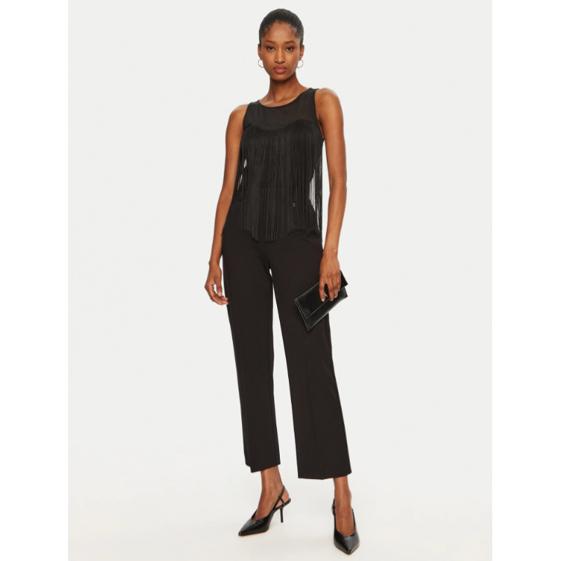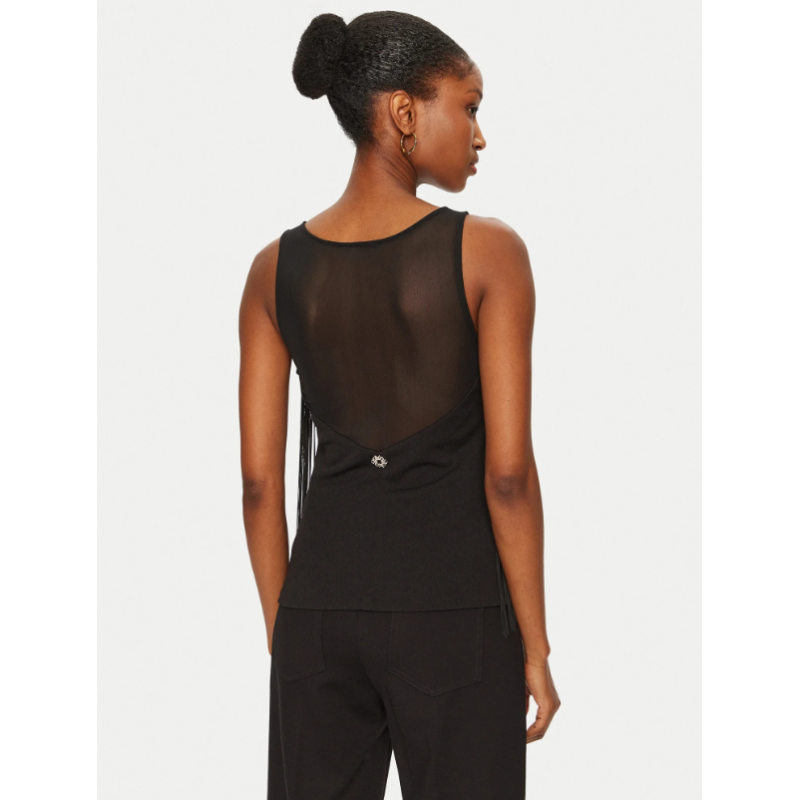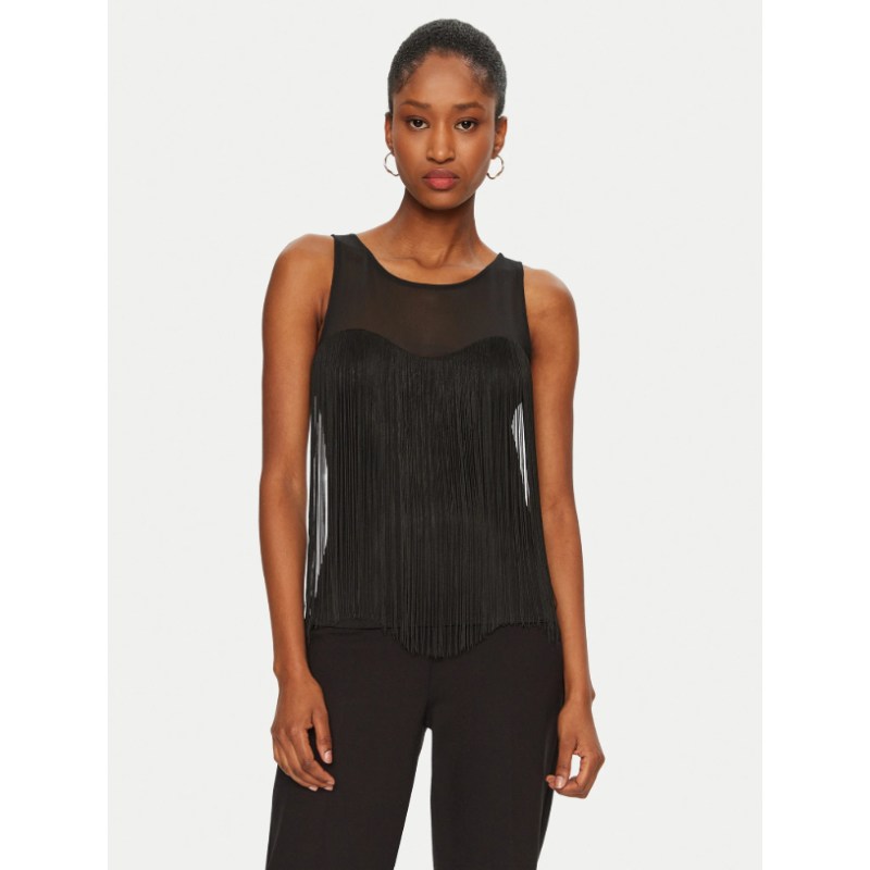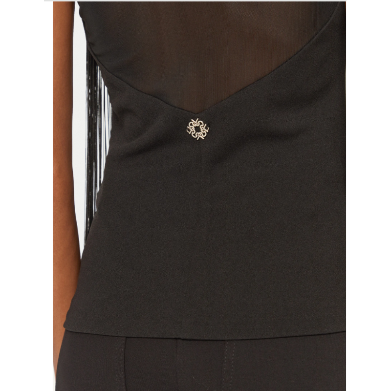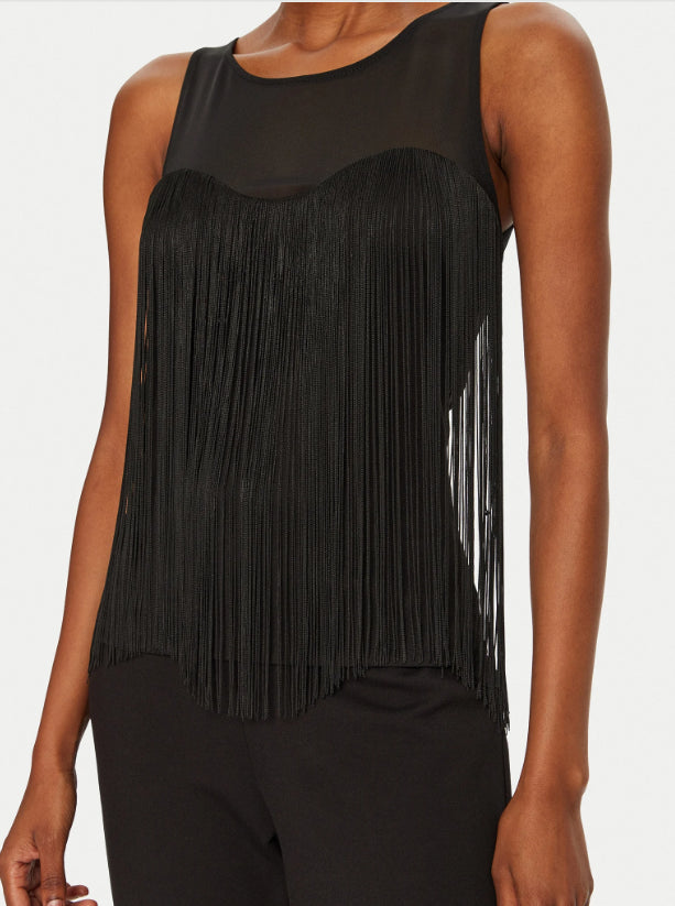 Top smanicato Rinascimento: frange applicate, tessuto trasparente, spalla larga. Eleganza e stile per i tuoi eventi speciali.